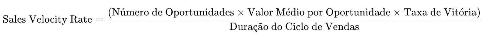 A Sales Velocity Rate (Taxa de Velocidade de Vendas) é um indicador menos comum, mas muito útil para medir a eficiência do pipeline de vendas. Ela combina quatro fatores importantes: número de oportunidades, valor médio por oportunidade, taxa de vitória e duração do ciclo de vendas.